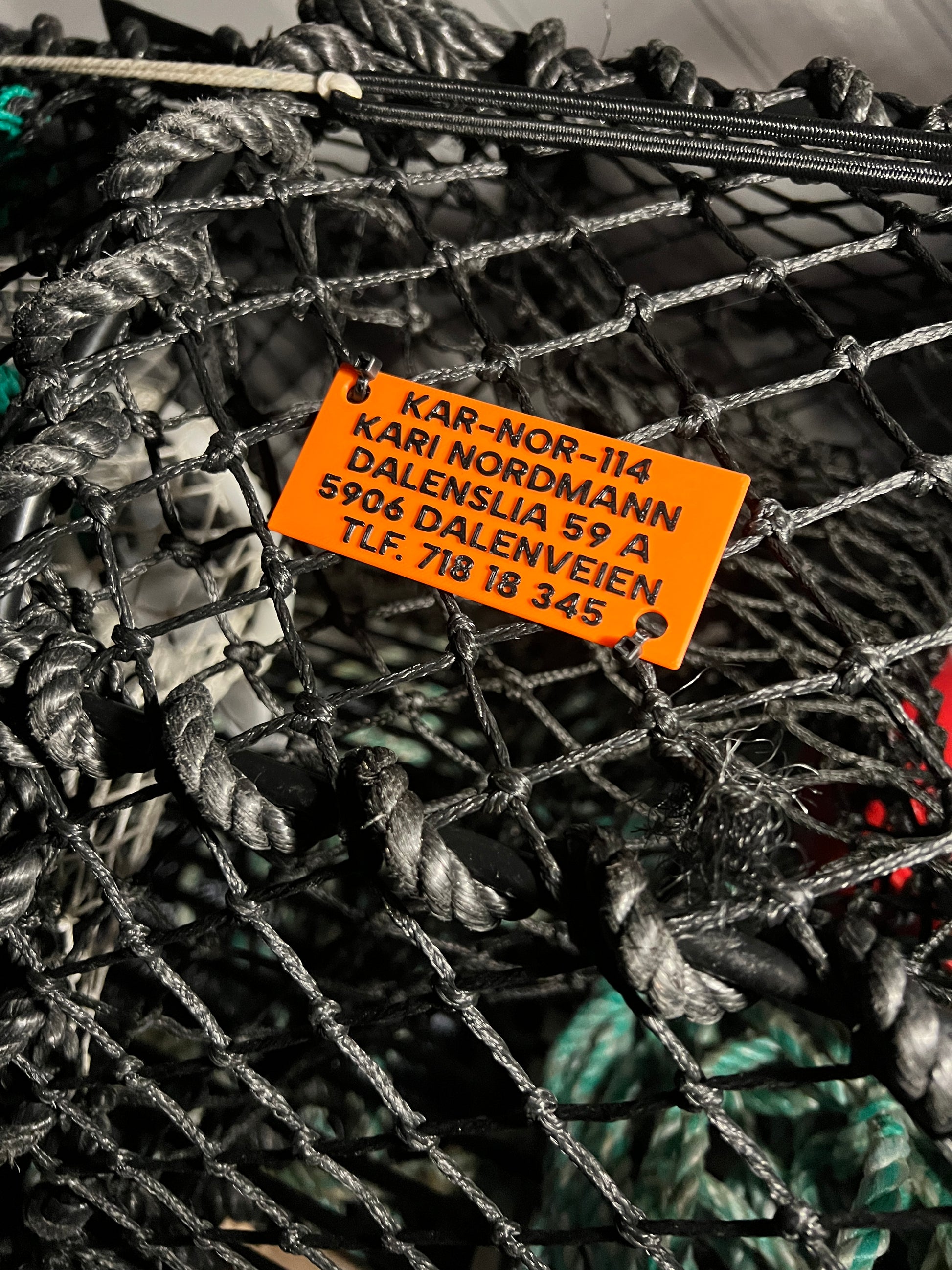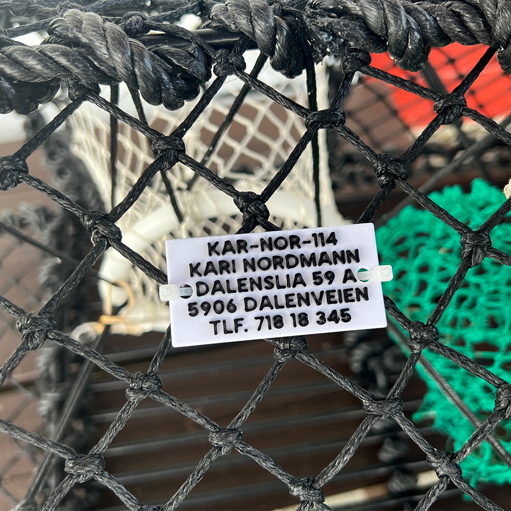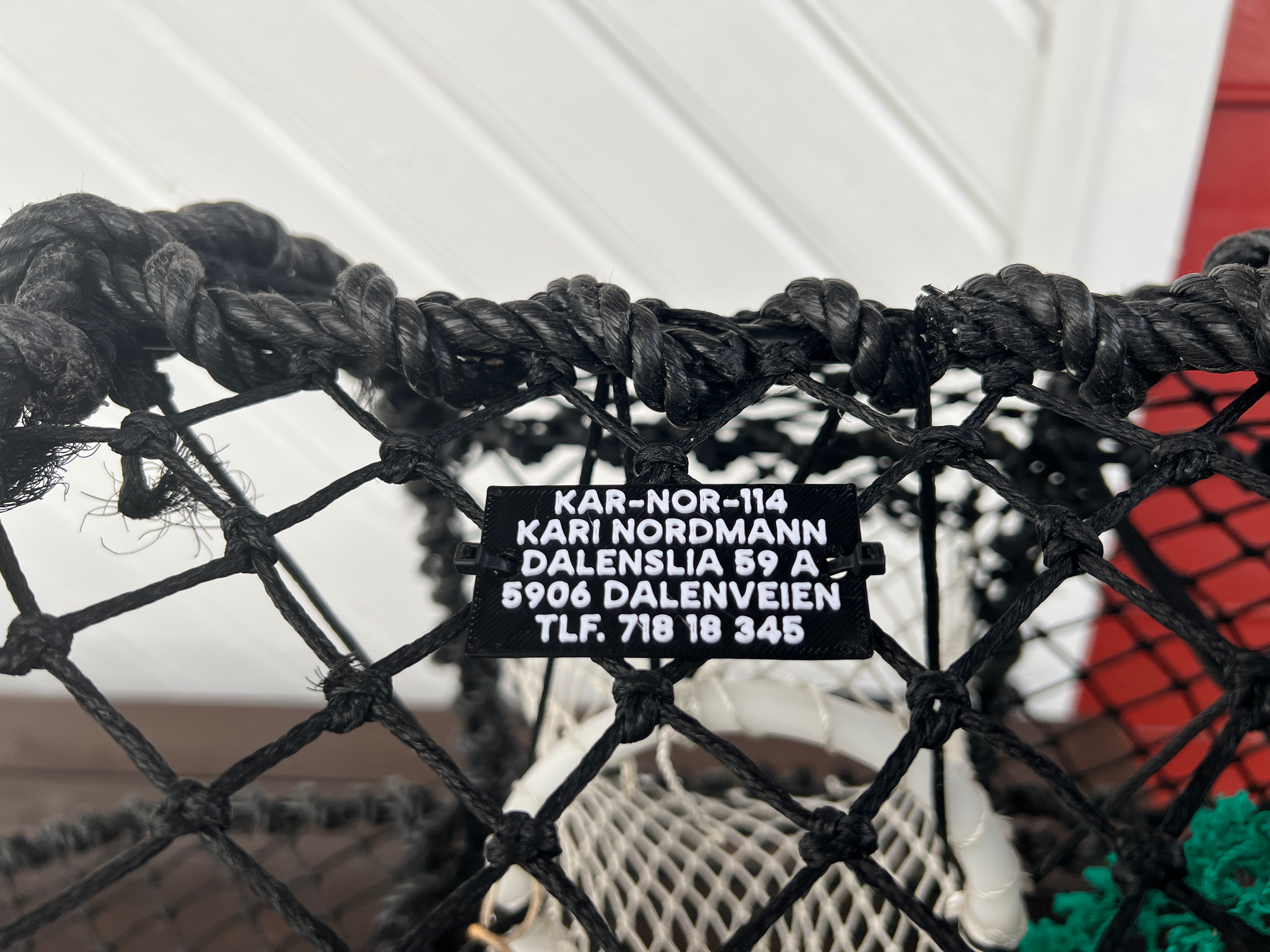 Dette merket oppfyller fiskeridirektoratets krav til merking av fiskeredskap også til bruk under hummerfiske (Forutsetter at man er registrert hos fiskeridirektoratet oppgir deltakernummer, folkeregistrert adresse og navn på skiltet).