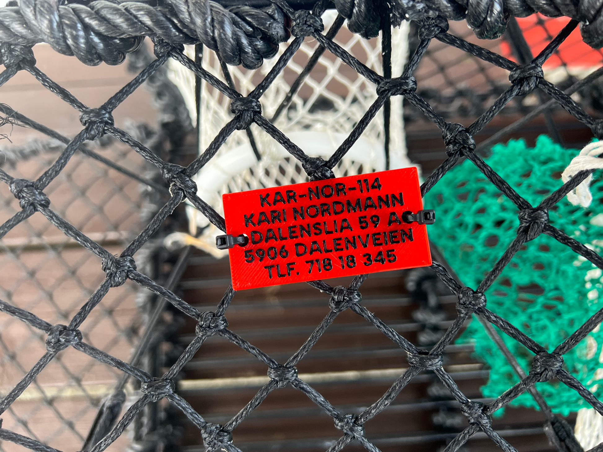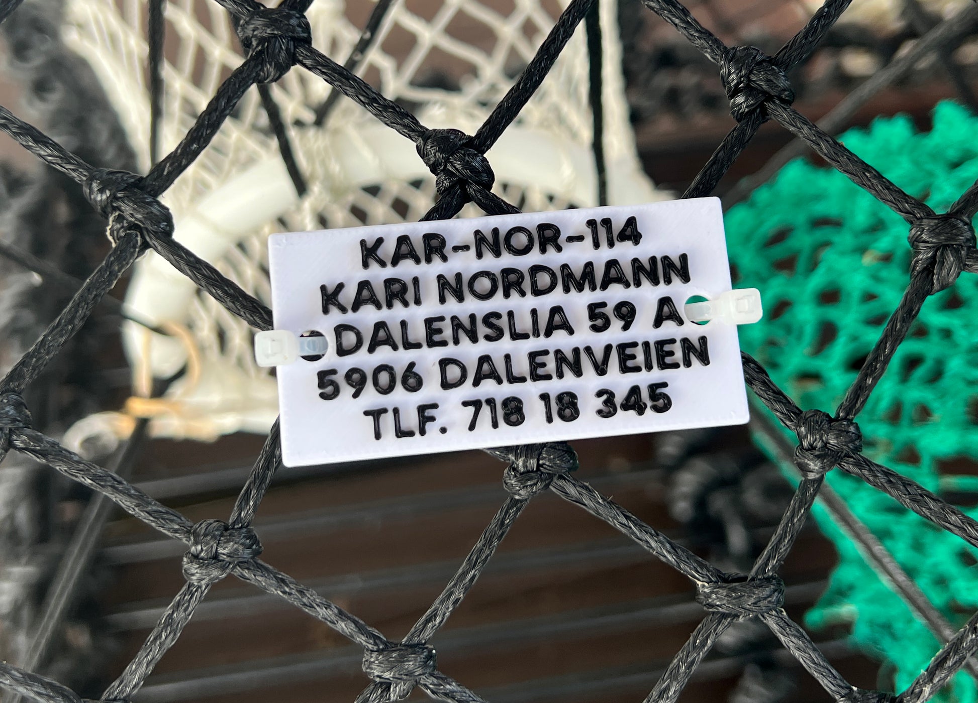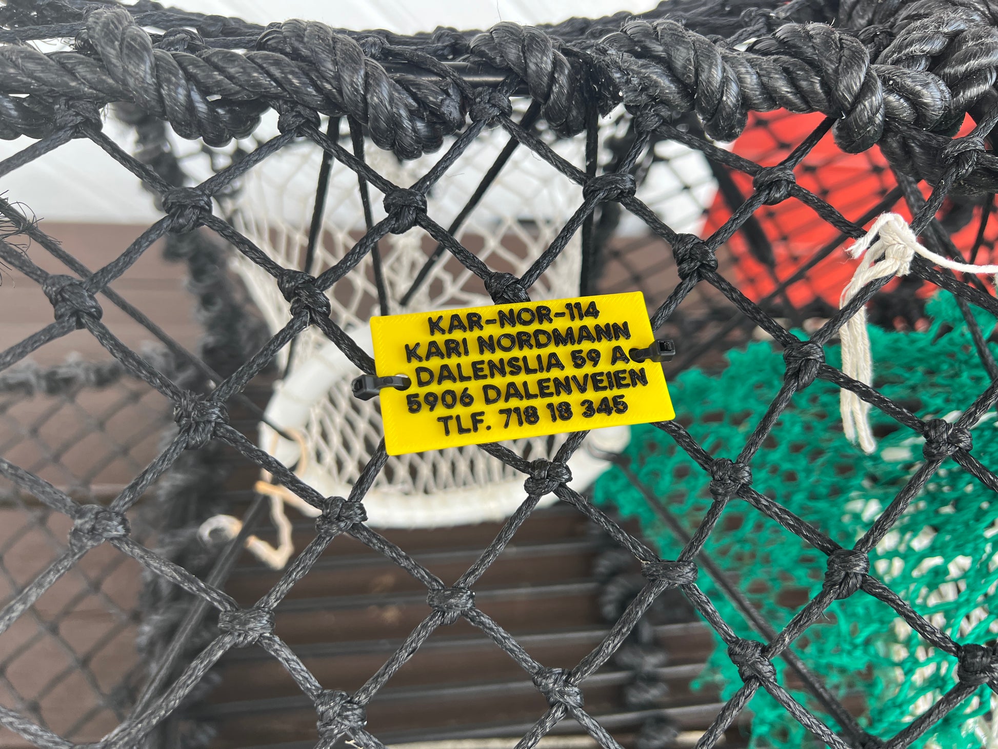 Dette merket oppfyller fiskeridirektoratets krav til merking av fiskeredskap også til bruk under hummerfiske (Forutsetter at man er registrert hos fiskeridirektoratet oppgir deltakernummer, folkeregistrert adresse og navn på skiltet).